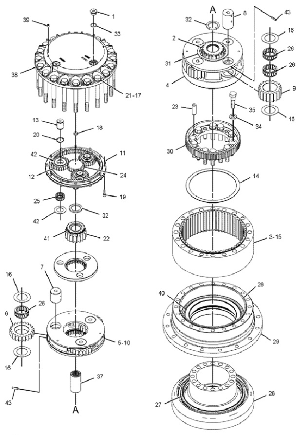 Номер позиции на схеме (см. ниже) Каталожный № Наименование Размеры 24 191-2521 Вал редуктора хода 23T 13S 154L Планетарная передача 1-ая 18S 12 7Y-0676 Шестерня планетарная (1-ый блок) 24T 56ID 21H 13 7Y-0656 Вал сателлита (1-ый блок) 40*45.5 42 094-0584 Шайба (1-ый блок) 20 8T-4240 Стопорное кольцо (1-ый блок) Штифт пружинный (1-ый блок) 1-ая планетарная передача к-т 18S 32 7Y-0595 Шайба (2-ой блок) 41 093-1731 Стопорное кольцо (2-ой блок) 22 110-7231 Шестерня солнечная (2-ой блок) 18T 58ID 62H 5 7Y-0645 Планетарная передача 2-ая 21S 77H 7 7Y-0661 Вал сателлита (2-ой блок) 66*60.5 6 7Y-0659 Шестерня планетарная (2-ой блок) 22T 16 7Y-1094 Шайба (2-ой блок) 43 095-0891 Штифт пружинный (2-ой блок) 2-ая планетарная передача к-т 21S 77H 2 7Y-0639 Шестерня солнечная (3-ий блок) 21T 67ID 95H 4 7Y-0643 Планетарная передача 3-я (водило) 66S 124H 9 7Y-0663 Шестерня планетарная (3-ий блок) 20T 86ID 56H 8 7Y-0662 Вал сателлита (3-ий блок) 66*94 43 095-0891 Штифт пружинный (3-ий блок) 16 7Y-1094 Шайба (3-ий блок) 31 7Y-0644 Шайба (3-ий блок) 3-я планетарная передача к-т 66S 124H 11 7Y-0673 Шестеренчатое кольцо 73T 374OD 26H 3 7Y-0642 Шестеренчатое кольцо (2-ой блок) 63T 498OD 139H 30 227-6192 Диск-шестерня 66S 339*46 23 114-1541 Вал сателлита 20*70 34 6V-8237 Шайба 37 191-2645 Муфта 13S 111L 28 227-6190 Корпус гидромотора 29 227-6191 Ступица 14 7Y-1057 Шайба 38 191-2526 Крышка 18 094-0577 Крышка Вал гидромотора 13*38S 339L Редуктор в сборе без гидромотора