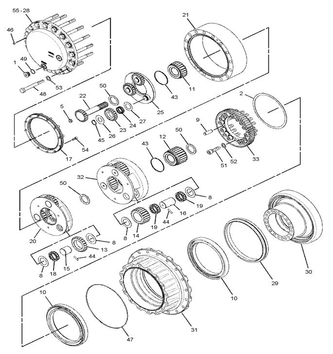 Номер позиции на схеме (см. ниже) Каталожный № Наименование Размеры 22 191-2683 Вал редуктора хода 20T 14S 224.5L 25 191-2686 Планетарная передача 1-ая (водило) 24S 22H Вал сателлита (1-ый блок) φ34*40 23 191-2684 Шестерня планетарная (1-ый блок) 21T 54ID 18H 24 191-2685 Подшипник ходовой (1-ый блок) 42*54*18 26 191-2689 Шайба (1-ый блок) 27 191-2690 Шайба (1-ый блок) 45 096-0433 Стопорное кольцо (1-ый блок) 1-ая планетарная передача к-т 24S 43 093-1731 Кольцо 11 169-5589 Шестерня солнечная (2-ой блок) 24T 58ID 50.5H 20 191-2571 Планетарная передача 2-ая (водило) 24S 61.5H 13 169-5592 Шестерня планетарная (2-ой блок) 23T 73ID 21H 8 094-1528 Шайба (2-ой блок) 15 169-5601 Вал сателлита (2-ой блок) φ53*50.5 44 095-0891 Штифт пружинный (2-ой блок) 18 191-2569 Подшипник ходовой (2-ой блок) 53*73*21 2-ая планетарная передача к-т 24S 12 169-5590 Шестерня солнечная (3-ий блок) 24T 58ID 85.5H 32 267-6799 Планетарная передача 3-ая (водило) 58S 120H 14 169-5593 Шестерня планетарная (3-ий блок) 23T 73ID 50H 16 169-5602 Вал сателлита (3-ий блок) φ53*84 8 094-1528 Шайба (3-ий блок) 44 095-0891 Штифт пружинный (2-ой блок) 19 Подшипник ходовой (3-ий блок) 53*73*50 3-я планетарная передача к-т 58S 17 171-9387 Шестеренчатое кольцо (1-ый блок) 64T 315*20 54 9X-6032 Болт M10*35 50 7Y-0595 Шайба (2-ой, 3-ий блок) 21 191-2676 Шестеренчатое кольцо 72T 417.5OD 124H 47 171-9298 Уплотнительное кольцо 33 267-6800 Шестерня 58T 2 267-6871 Шайба 30 267-6797 Корпус гидромотора φ415*182 28 199-4503 Крышка φ428*77 48 179-8733 Болт M20*170 52 8T-4123 Шайба 5 094-0580 Пластина φ24*12 31 267-6798 Ступица φ526*179.5 10 168-8452 Главный подшипник 260*330*35 29 207-1571 Плавающее уплотнение 318*346*38 267-6796 Редуктор в сборе без гидромотора F:20-M20,S:18-M20