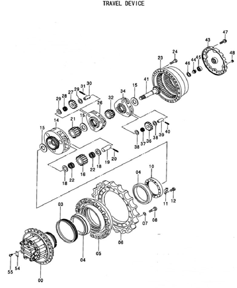 Номер позиции на схеме (см. ниже) Каталожный № Наименование Размеры 41 2048000 Вал редуктора хода (1-ая ступень) 24T,23S 34 1022196 Планетарная передача (1-ая ступень) 27S,53H 36 3075001 Шестерня планетарная (1-ая ступень) 28T,18H 38 4284520 Шайба упорная (1-ая ступень) 39 4269472 Вал сателлита (1-ая ступень) 40 4192020 Палец подпружиненный (1-ая ступень) 15 4401293 Шайба упорная 1-ая планетарная передача к-т 32 3074989 Шестерня солнечная (2-ая ступень) 27T 26 1022197 Планетарная передача 2-ая 19S,76H 27 3075002 Шестерня планетарная (2-ая ступень) 26T,31.5H 29 4284521 Шайба упорная (2-ая ступень) 30 4269451 Вал сателлита (2-ая ступень) 31 4197763 Палец подпружиненный (2-ая ступень) 25 4401293 Шайба упорная 2-ая планетарная передача к-т 21 3075005 Шестерня солнечная (3-я ступень) 19T 14 1022198 Планетарная передача 3-я 69S,164H 15 4401293 Шайба упорная 16 3075003 Шестерня планетарная (3-я ступень) 20T,64H 18 4269470 Шайба упорная (3-я ступень) 19 4269452 Вал сателлита (3-я ступень) 20 4192021 Палец подпружиненный (3-я ступень) 3-я планетарная передача к-т 23 2047884 Вал гидромотора хода 29*23S 03 1022195 Шестеренчатое кольцо 59*81T 43 1022179 Корпус редуктора хода 44 2045031 Крышка редуктора хода 16 BOLTS 930451 Стопорное кольцо Если не нашли нужную запчасть, отправьте запрос по электронной почте или перезвоните в Отдел продаж по телефону.