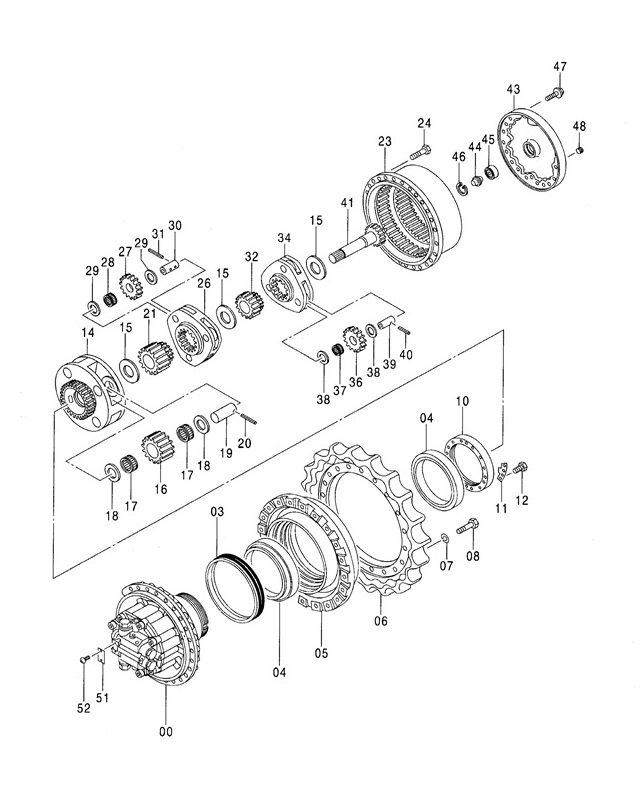 Номер позиции на схеме (см. ниже) Каталожный № Наименование Размеры 41 2051884 Вал редуктора хода (1-ый блок) 23T 23S 34 1032597 Планетарная передача (1-ый блок) 29S 36 3103551 Шестерня планетарная (1-ый блок) 31T 38 4642993 Пластина (1-ый блок) 39 4269472 Вал сателлита (1-ый блок) 40 4192020 Палец подпружиненный (1-ый блок) 15 4621530 Шайба упорная 1-ая планетарная передача к-т 32 3103552 Шестерня солнечная (2-ой блок) 29T 26 1032598 Планетарная передача (2-ой блок) 23S 27 3103553 Шестерная планетарная (2-ой блок) 28T 29 4284521 Паластина (2-ой блок) 30 4269451 Вал сателлита (2-ой блок) 31 4197763 Палец подпружиненный (2-ой блок) 15 4621530 Шайба упорная 2-ая планетарная передача к-т 21 3103554 Шестерня солнечная (3-ий блок) 23T 14 1032599 Планетарная передача (3-ий блок) 69S 15 4621530 Шайба упорная 16 3103555 Шестерня планетарная (3-ий блок) 25T 18 4269470 Шайба упорная (3-ий блок) 19 4269452 Вал сателлита (3-ий блок) 20 4207947 Палец подпружиненный (3-ий блок) 3-я планетарная передача к-т 23 1032600 Корпус редуктора 85*73T 05 1033164 Ступица (барабан редуктора хода) 43 1032596 Крышка 44 4277474 Стопор 46 930451 Кольцо 10 3094717 Гайка 11 4470326 Стопор 2047884 Вал гидромотора 29S 23S 0005207 Корпус гидромотора 69S 9244944; 9256991 Редуктор хода в сборе без гидромотора
