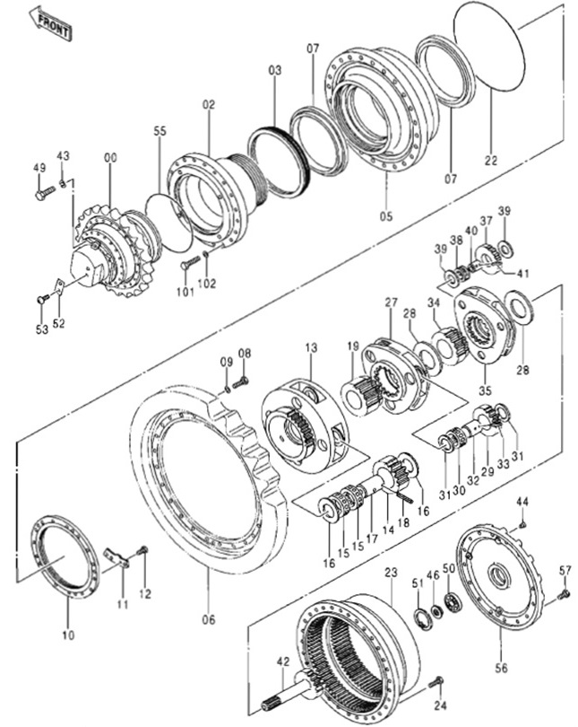 Номер позиции на схеме (см. ниже) Каталожный № Наименование Размеры 42 2044685 Вал редуктора хода (1-ый блок) 30T 16S 300L 35 1015505 Планетарная передача 1-ая 36S 57H 37 3053098 Шестерня планетарная (1-ый блок) 31T,55ID,20.5H,135.2OD 40 4263901 Вал сателлита (1-ый блок) φ39*44 38 4452480 Подшипник (1-ый блок) 39*55*20.5 41 4222030 Палец подпружиненный (1-ый блок) 39 4269295 Шайба упорная (1-ый блок) φ80φ40.2*0.5 28 4263905 Подшипник (1-ый блок) φ158.5φ79*10.5 1-ая планетарная передача к-т 36S 57H 34 3053785 Шестерня солнечная (2-ой блок) 36T,90ID,62H 27 1015523 Планетарная передача (2-ой блок) 24S,83.5H 29 3053194 Шестерная планетарная (2-ой блок) 28T 70ID 36H 32 4263902 Вал сателлита (2-ой блок) φ50*64 30 4452483 Подшипник (2-ой блок) 50*70*36 33 4203180 Штифт пружинный (2-ой блок) 31 4201968 Упорная пластина (2-ой блок) φ82.5φ50.8*0.5 28 4263905 Шайба (2-ой блок) φ158.5φ90.5*3 2-ая планетарная передача к-т 24S,83.5H 19 3053786 Шестерня солнечная (3-й блок) 24T,90ID,95.5H 13 1015883 Планетарная передача (3-й блок) 60S,160H 14 3053195 Шестерня планетарная (3-й блок) 22T,82ID,60H,147OD 17 4263903 Вал сателлита (3-й блок) φ60*104.5 16 4219595 Упорная пластина (3-й блок) φ98φ60.5*1.2 15 4452484 Подшипник (3-й блок) 60*82*30 18 4207947 Штифт пружинный (3-й блок) 3-я планетарная передача к-т 60*82*30 07 4266497,4200411 Главный подшипник 300*380*38,BA300-5 23 1018360 Шестеренчатое кольцо 68*93T φ548*213 05 1015882 Корпус редуктора 24 SPROCKET HOLES 02 Корпус гидромотора 60S 03 4344155 Плавающее уплотнение 366*394*19 22 4203187 Уплотнительное кольцо 56 1017702,1023348 Крышка φ453*30 46 4279343 Кнопка φ50*18.5 50 4274541 Подшипник 6909 10 3043140 Гайка φ360*21 2047884 Вал гидромотора 16S 32S 305L Редуктор в сборе без гидромотора