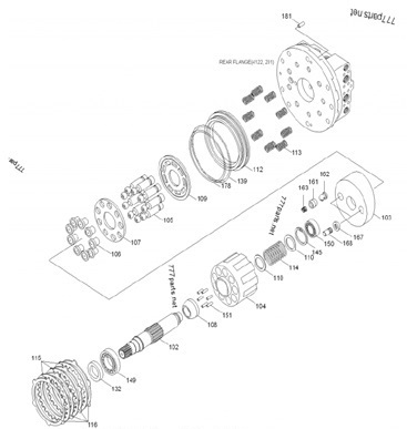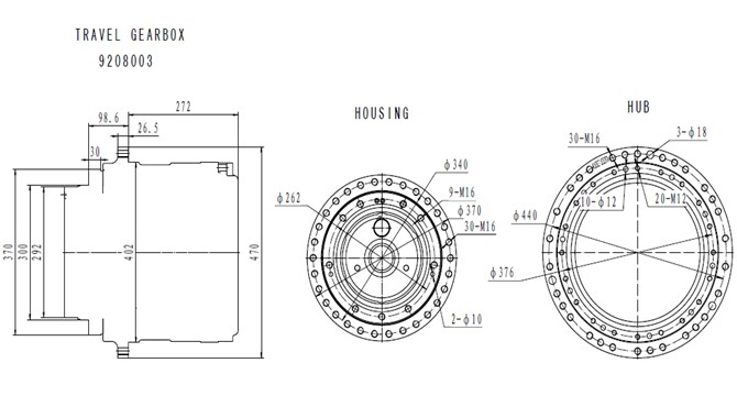 Номер позиции на схеме (см. ниже) Каталожный № Наименование Размеры 7 XKAH-00445 Вал редуктора хода 8T 21S 123L 3 XKAH-00909 Планетарная передача 172H 6 XKAH-00910 Шестерня планетарная 20*28T 70OD 122H 9 XKAH-00911 Вал сателлита φ50*169 34 XKAH-00429 Палец подпружиненный 14 XKAH-00912 Шайба упорная φ79φ50.5*4 XKAH-00908 Водило в сборе 172H 20 XKAH-00436 Шайба проставочная 8 XKAH-00907 Шестерня редуктора 56T 309OD 45H 17 XKAH-00437 Вал сателлита φ17.5*48 4 XKAH-00904 Шестерня планетарная 64T 400OD 51H 5 XKAH-00914 Шестерня планетарная 56T346OD 88H 19 XKAH-00022 Муфта 21S 55L 2 XKAH-00905 Корпус редуктора 23 XKAH-00435 Уплотнительное кольцо 12 XKAH-00442 Шайба φ276.5φ256.4*3.7 13 XKAH-00915 Крышка редуктора 1 XKAH-00902 Ступица 27 XKAH-00431 Вал сателлита φ12*60 P2-102 XKAH-00410 Вал гидромотора 23*21S 287L XKAH-00901 Редуктор в сборе без гидромотора