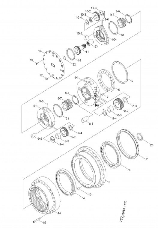 Номер позиции на схеме (см. ниже) Каталожный № Наименование Размеры 11 XKAQ-00203 Вал-шестерня (1-ая ступень) 23T 14S 154L 10-1 XKAQ-00198 Водило (1-ая ступень) 26S 50.5H 10-5 XKAQ-00202 Палец (1-ая ступень) φ40*41.5 10-2 XKAQ-00199 Шестерня планетарная (1-ая ступень) 26T 55ID 22H 10-4 XKAQ-00395 Шайба упорная (1-ая ступень) φ72φ40.5*0.5 18 XKAQ-00208 Упорное кольцо (1-ая ступень) φ143φ126*6 9-6 XKAQ-00194 Палец подпружиненный (1-ая ступень) 10 XKAQ-00400 Водило в сборе (1-ая ступень) 26S 9-7 XKAQ-00195 Шестерня солнечная (2-ая ступень) 26T 60ID 59H 9-1 XKAQ-00397 Планетарная передача (2-ая ступень) 21S 72H 9-2 XKAQ-00392 Шестерня планетарная (2-ая ступень) 25T 58ID 35H 9-5 XKAQ-00193 Палец (2-ая ступень) φ38*59 9-4 XKAQ-00394 Шайба упорная (2-ая ступень) 72*38.5*1.5 9-6 XKAQ-00194 Палец подпружиненный (2-ая ступень) 21 XKAQ-00210 Кольцо упорное (2-ая ступень) φ155φ136*6 9 XKAQ-00399 Водило в сборе (2-ая ступень) 21S 72H 8-7 XKQA-00186 Шестерня солнечная (3-я ступень) 21T 60ID 82H 8-1 XKAQ-00396 Планетарная передача (3-я ступень) 50S 127H 8-2 XKAQ-00389 Шестерня планетарная (3-я ступень) 25T 67.7ID 52H 8-5 XKAQ-00184 Палец (3-я ступень) φ47.7*85 8-6 XKAQ-00185 Палец подпружиненный (3-я ступень) 8-4 XKAQ-00391 Шайба упорная (3-я ступень) φ80φ48*1.5 20 XKAQ-00212 Кольцо уплотнительное (3-я ступень) φ95φ72*12 21 XKAQ-00213 Кольцо упорное (3-я ступень) φ169φ145*6 8 XKAQ-00398 Водило в сборе (3-я ступень) 50S 14 Шестеренчатое кольцо 71*76T Корпус гидромотора 50S 6 XKAQ-00177 Гайка стопорная φ290φ205*24 7 XKAQ-00178 Болт M12*30 3 XKAQ-00174 Корпус редуктора φ525*167 17 XKAQ-00209 Крышка редуктора φ363*26 22 XKAQ-00214 Пластина крышки редуктора φ20*12.5 13 XKAQ-00205 Палец 16*40 9-8 XKAQ-00196 Стопорное кольцо (2-ая ступень) 110 8-8 XKAQ-00187 Кольцо стопорное (3-я ступень) 110 23 XKAQ-00215 Муфта 14T 68L XKAY-00207 Вал гидромотора (1-ая ступень) 14S 16S 340L Редуктор в сборе без гидромотора F:18-M24,S:26-M20