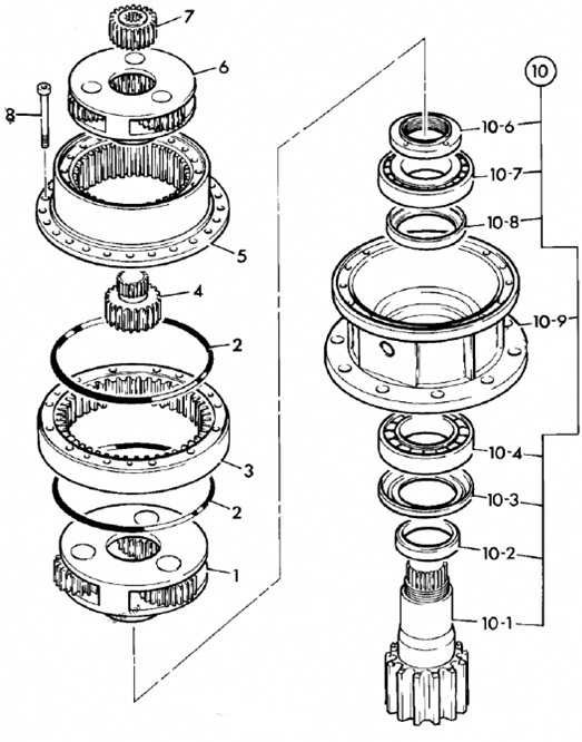 Номер позиции на схеме (см. ниже) Каталожный № Наименование Размеры 1 05/903860 Планетарная передача 2-ая 36S 143H 2 05/903861 Кольцо уплотнительное 288*3.55 3 05/903862 Зубчатое кольцо 68T 74H 4 05/903863 Шестерня солнечная (2-ой блок) 22T 27S 97H 5A 05/903865 Зубчатое кольцо 78T 228S 38H 5 05/903864 Зубчатое кольцо 78T 228S 38H Корпус редуктора поворота 228S 6 05/903866 Планетарная передача 1-ая 27S 7 05/903867 Шестерня солнечная (1-ый блок) 25T 13S 52H 8 05/903868 Шуруп M16*120 10 05/903873 Вал редуктора в сборе 10-1 05/903869 Вал-шестерня 14T 36S 336.5L 10-2 05/903870 Шайба 10-4 05/903872 Подшипник 120*215*58,22224CA 10-6 05/903874 Гайка M82*2 10-7 05/903875 Подшипник 22217,85*150*36 10-8 05/903876 Уплотнение 100*140*15 10-9 05/903877 Корпус редуктора поворота