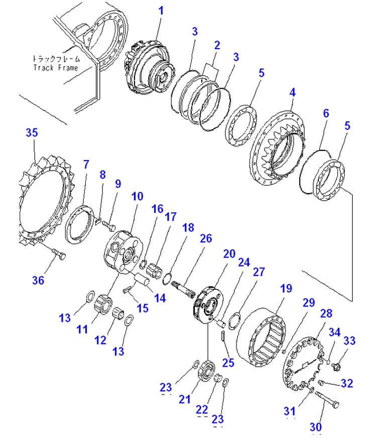 Номер позиции на схеме (см. ниже) Каталожный № Наименование 26 22U-27-21110 Вал редуктора хода 20 22U-27-21161 Планетарная передача 1-ая 21 22U-27-21120 Шестерня планетарная (1-ый блок) 23 20Y-27-21240 Шайба упорная (1-ый блок) 24 20Y-27-21220 Вал сателлита (1-ый блок) 25 20Y-27-21280 Палец (1-ый блок) 27 20Y-27-21310 Шайба упорная (1-ый блок) 1-ая планетарная передача к-т 17 22U-27-21130 Шестерня солнечная (2-ой блок) 10 22U-27-21170 Планетарная передача (2-ой блок) 11 22U-27-21140 Шестерня планетарная (2-ой блок) 13 20Y-27-21250 Шайба (2-ой блок) 14 22U-27-21230 Вал сателлита (2-ой блок) 15 20Y-27-21290 Штифт пружинный (2-ой блок) 16 20Y-27-13310 Шайба (2-ой блок) 2-ая планетарная передача к-т 29 20Y-27-22250 Кнопка 28 22U-27-21192 Крышка 4 22U-27-21182 Ступица 19 22U-27-21152/3 Шестеренчатое кольцо 7 20Y-27-22261 Гайка 8 20Y-27-22270 Стопорная пластина 708-8F-04660 Корпус гидромотора 708-8F-32110 Вал гидромотора 04065-07225 Стопорное кольцо 708-8F-12230 Шайба 206-27-00300,00301 Редуктор в сборе без гидромотора