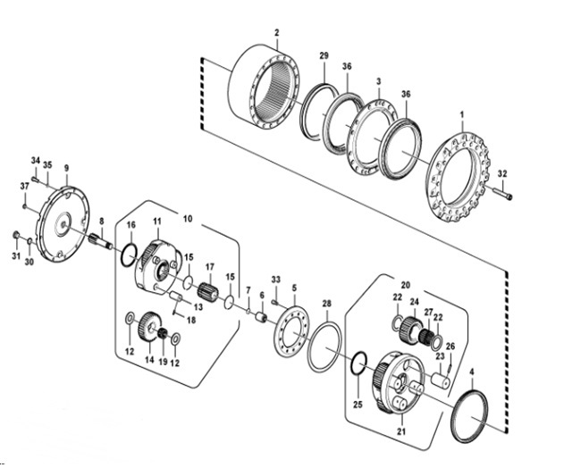 Номер позиции на схеме (см. ниже) Каталожный № Наименование Размеры 8 VOE14575733 Вал редуктора хода 9T 21S 166.5L 11 VOE14505751 Планетарная передача 1-ая 17S 14 VOE14505755 Шестерня планетарная (1-ый блок) 36T 51ID 40H 13 VOE14505757 Вал сателлита (1-ый блок) φ35*67.5 12 VOE14505756 Шайба (1-ый блок) φ65*35.3*5 18 SA9325-06012 Штифт пружинный (1-ый блок) 16 VOE14505753 Шайба (1-ый блок) φ127.5*116*6 1-ая планетарная передача к-т 17S 17 VOE14505752 Шестерня солнечная (2-ой блок) 17T 37ID 95H 21 VOE14505746 Планетарная передача (2-ой блок) 93S 124H 24 VOE14505747 Шестерная планетарная (2-ой блок) 32T 76ID 60H 23 VOE14505749 Вал сателлита (2-ой блок) φ60*94 22 VOE14505748 Шайба (2-ой блок) φ85*60.5*2.5 26 VOE951993 Штифт пружинный (2-ой блок) 25 VOE14505753 Шайба (2-ой блок) φ127.5*116*6 20 VOE14505738 2-ая планетарная передача к-т 93S 4 VOE14505744 Фиксатор ступицы 84S 93S 5 VOE14505745 Шайба φ275*18.5 3 VOE14505742 Уплотнение φ410*31.5 28 VOE14507345 Шайба φ275*237.2*0.6 6 VOE14575734 Муфта 21S 45H 1 VOE14505739 Ступица 37 SA7117-15230 Шайба упорная